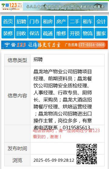 晶龙地产物业公司招聘项目经理、前期资料员;晶龙餐饮公司招聘安全质检经理、人事经理、行政专员、厨师长、采购员;晶龙大酒店招聘餐厅经理、烘焙运营经理;晶龙物流公司招聘进出口操作主管,岗位多多,有意者电话联系:0319585613 【电话咨询时,请一定说明在宁晋123看到的,谢谢!】 |