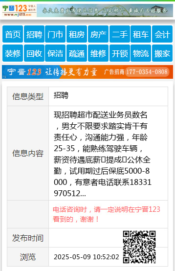 现招聘超市配送业务员数名,男女不限要求踏实肯干有责任心,沟通能力强,年龄25-35,能熟练驾驶车辆,薪资待遇底薪➕提成➕公休全勤,试用期过后保底5000-8000,有意者电话联系18331970512 【电话咨询时,请一定说明在宁晋123看到的,谢谢!】 |