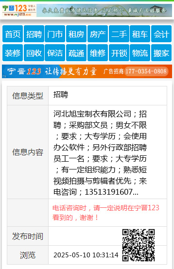 河北旭宝制衣有限公司;招聘;采购部文员;男女不限;要求;大专学历;会使用办公软件;另外行政部招聘员工一名;要求;大专学历;有一定组织能力;熟悉短视频拍摄与剪辑者优先;来电咨询;13513191607