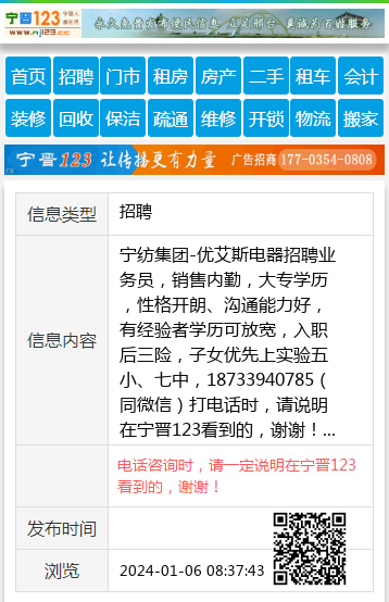 宁纺集团-优艾斯电器招聘业务员,销售内勤,大专学历,性格开朗、沟通能力好,有经验者学历可放宽,入职后三险,子女优先上实验五小、七中,18733940785(同微信)