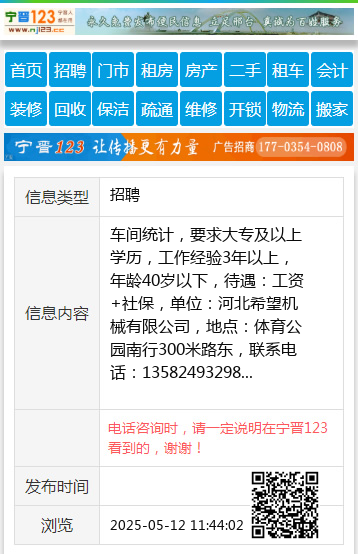 车间统计,要求大专及以上学历,工作经验3年以上,年龄40岁以下,待遇:工资+社保,单位:河北希望机械有限公司,地点:体育公园南行300米路东,联系电话:13582493298 【电话咨询时,请一定说明在宁晋123看到的,谢谢!】 |