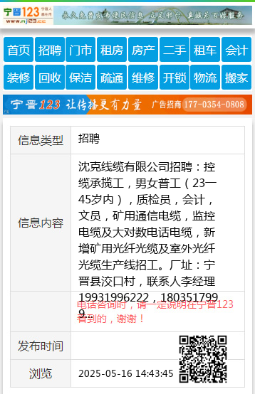 沈克线缆有限公司招聘:控缆承揽工,男女普工(23一45岁内),质检员,会计,文员,矿用通信电缆,监控电缆及大对数电话电缆,新增矿用光纤光缆及室外光纤光缆生产线招工。厂址:宁晋县洨口村,联系人李经理19931996222,18035179997 【电话咨询时,请一定说明在宁晋123看到的,谢谢!】 |