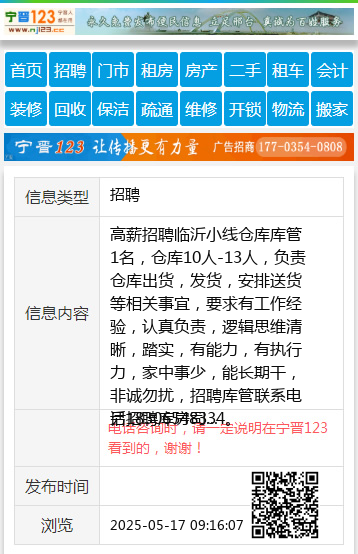高薪招聘临沂小线仓库库管1名,仓库10人-13人,负责仓库出货,发货,安排送货等相关事宜,要求有工作经验,认真负责,逻辑思维清晰,踏实,有能力,有执行力,家中事少,能长期干,非诚勿扰,招聘库管联系电话18306548334。