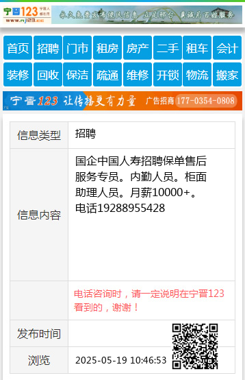 国企中国人寿招聘保单售后服务专员。内勤人员。柜面助理人员。月薪10000+。电话19288955428