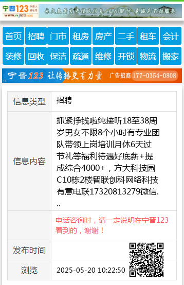 抓紧挣钱啦纯接听18至38周岁男女不限8个小时有专业团队带领上岗培训月休6天过节礼等福利待遇好底薪+提成综合4000+,方大科技园C10栋2楼智联创科网络科技有意电联17320813279微信 【电话咨询时,请一定说明在宁晋123看到的,谢谢!】 |