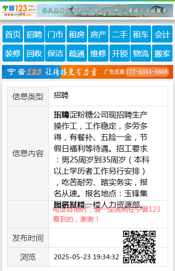 玉锋淀粉糖公司现招聘生产操作工,工作稳定,多劳多得,有餐补、五险一金,节假日福利等待遇。招工要求:男25周岁到35周岁(本科以上学历者工作另行安排),吃苦耐劳、踏实务实,报名从速。报名地点:玉锋集团研发楼一楼人力资源部。