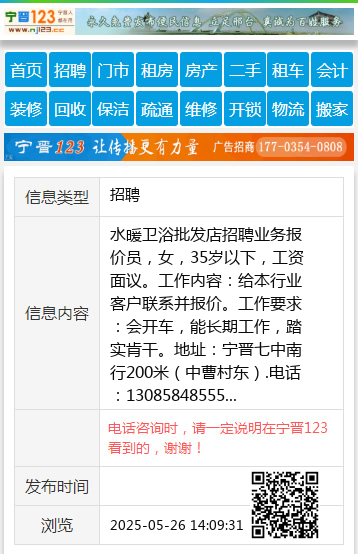 水暖卫浴批发店招聘业务报价员,女,35岁以下,工资面议。工作内容:给本行业客户联系并报价。工作要求:会开车,能长期工作,踏实肯干。地址:宁晋七中南行200米(中曹村东).电话:13085848555 【电话咨询时,请一定说明在宁晋123看到的,谢谢!】 |