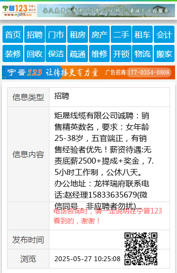 炬晟线缆有限公司诚聘:销售精英数名,要求:女年龄25-38岁,五官端正,有销售经验者优先!薪资待遇:无责底薪2500+提成+奖金,7.5小时工作制,公休八天。办公地址:龙祥瑞府联系电话:赵经理15833635679(微信同号,非应聘者勿扰) 【电话咨询时,请一定说明在宁晋123看到的,谢谢!】 |