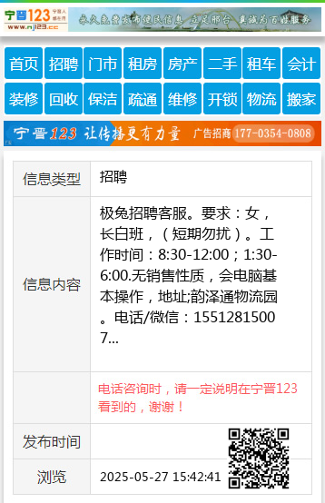 极兔招聘客服。要求:女,长白班,(短期勿扰)。工作时间:8:30-12:00;1:30-6:00.无销售性质,会电脑基本操作,地址;韵泽通物流园。电话/微信:15512815007