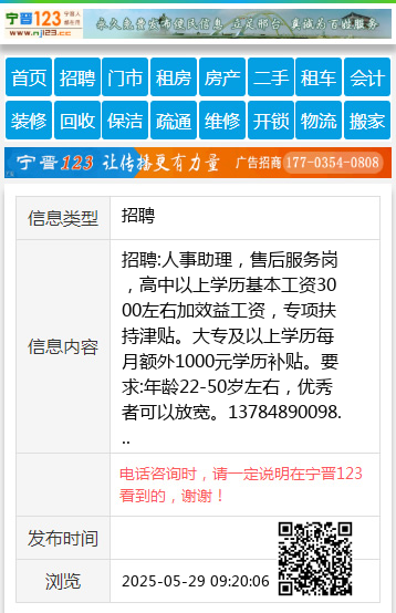 招聘:人事助理,售后服务岗,高中以上学历基本工资3000左右加效益工资,专项扶持津贴。大专及以上学历每月额外1000元学历补贴。要求:年龄22-50岁左右,优秀者可以放宽。13784890098 【电话咨询时,请一定说明在宁晋123看到的,谢谢!】 |