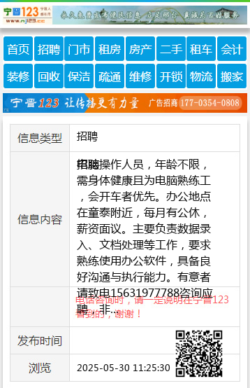 电脑操作人员,年龄不限,需身体健康且为电脑熟练工,会开车者优先。办公地点在童泰附近,每月有公休,薪资面议。主要负责数据录入、文档处理等工作,要求熟练使用办公软件,具备良好沟通与执行能力。有意者请致电15631977788咨询应聘,非诚勿扰。 【电话咨询时,请一定说明在宁晋123看到的,谢谢!】 |