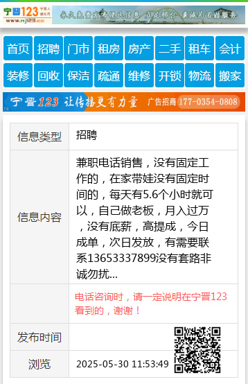 兼职电话销售,没有固定工作的,在家带娃没有固定时间的,每天有5.6个小时就可以,自己做老板,月入过万,没有底薪,高提成,今日成单,次日发放,有需要联系13653337899没有套路非诚勿扰 【电话咨询时,请一定说明在宁晋123看到的,谢谢!】 |