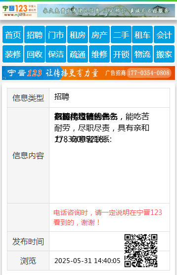 有技术过硬的优先,能吃苦耐劳,尽职尽责,具有亲和力,有意者联系:
