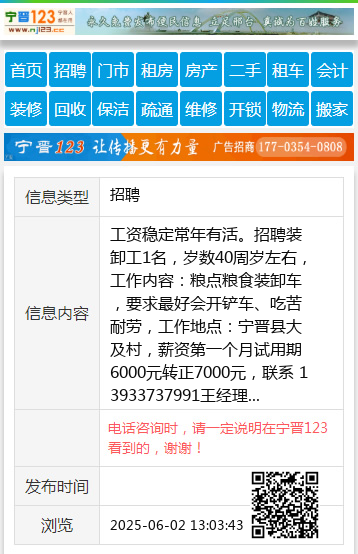工资稳定常年有活。招聘装卸工1名,岁数40周岁左右,工作内容:粮点粮食装卸车,要求最好会开铲车、吃苦耐劳,工作地点:宁晋县大及村,薪资第一个月试用期6000元转正7000元,联系 13933737991王经理 【电话咨询时,请一定说明在宁晋123看到的,谢谢!】 |