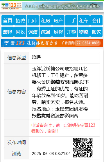 玉锋淀粉糖公司现招聘几名机修工,工作稳定,多劳多得,公司缴纳五险一金。