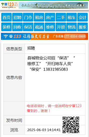 县城物业公司招“保洁”“维修工”“开扫地车人员”“保安”13831985083
