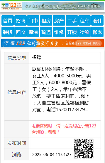 联硕机械招聘:年龄不限,女工5人,4000-5000元。男工5人,6000-8000元,暑假工(女)2人,常年有活不放假,要干活麻利的。地址:大曹庄管理区茂晟检测站对面,电话15200173479
