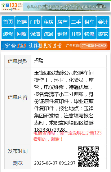 玉锋四区糖醇公司招聘车间操作工,环卫,化验员,库管,电仪维修,待遇优厚,报名需携带小二寸两张,身份证原件复印件,毕业证原件复印件,报名地点:玉锋集团研发楼,注意填写报名表时,求职意向填四区糖醇18233072928 【电话咨询时,请一定说明在宁晋123看到的,谢谢!】 |