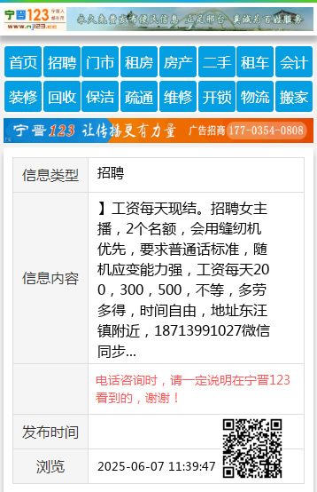 】工资每天现结。招聘女主播,2个名额,会用缝纫机优先,要求普通话标准,随机应变能力强,工资每天200,300,500,不等,多劳多得,时间自由,地址东汪镇附近,18713991027微信同步 【电话咨询时,请一定说明在宁晋123看到的,谢谢!】 |