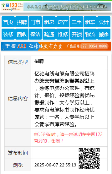 亿驰电线电缆有限公司招聘:缠云母带缠铜带各2名。