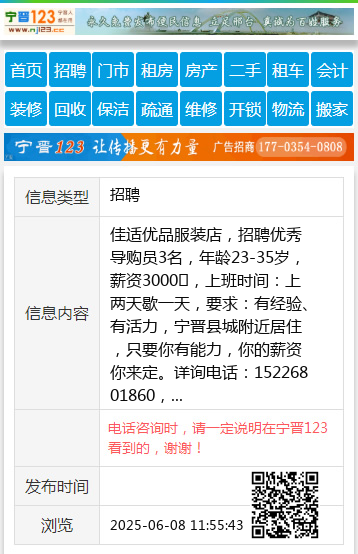 佳适优品服装店,招聘优秀导购员3名,年龄23-35岁,薪资3000➕,上班时间:上两天歇一天,要求:有经验、有活力,宁晋县城附近居住,只要你有能力,你的薪资你来定。详询电话:15226801860, 【电话咨询时,请一定说明在宁晋123看到的,谢谢!】 |
