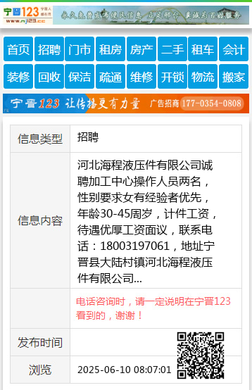 | 防骗提醒: | 宁晋123(www.nj123.cc)提醒您:手工活、网络兼职、刷单,都是骗子!凡以各种名义收取费用的都是骗子!找工作是往兜里挣钱,让你往外掏钱的都是骗子!异地招聘请提高警惕,谨防诈骗! |