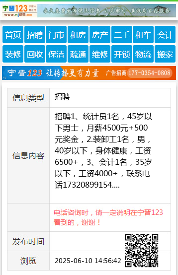 招聘1、统计员1名,45岁以下男士,月薪4500元+500元奖金,2.装卸工1名,男,40岁以下,身体健康,工资6500+,3、会计1名,35岁以下,工资4000+,联系电话17320899154. 【电话咨询时,请一定说明在宁晋123看到的,谢谢!】 |