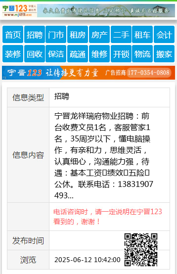 宁晋龙祥瑞府物业招聘:前台收费文员1名,客服管家1名,35周岁以下,懂电脑操作,有亲和力,思维灵活,认真细心,沟通能力强,待遇:基本工资➕绩效➕五险➕公休。联系电话:13831907493 【电话咨询时,请一定说明在宁晋123看到的,谢谢!】 |