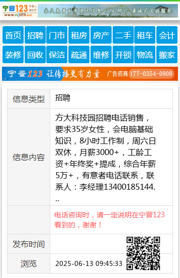 方大科技园招聘电话销售,要求35岁女性,会电脑基础知识,8小时工作制,周六日双休,月薪3000+,工龄工资+年终奖+提成,综合年薪5万+,有意者电话联系,联系人:李经理13400185144 【电话咨询时,请一定说明在宁晋123看到的,谢谢!】 |