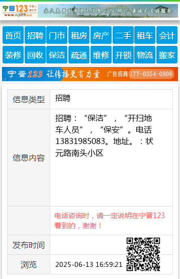招聘:“保洁”,“开扫地车人员”,“保安”。电话13831985083。地址。:状元路南头小区