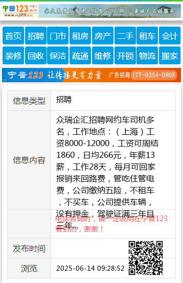 众瑞企汇招聘网约车司机多名,工作地点:(上海)工资8000-12000,工资可周结1860,日均266元,年薪13薪,工作28天,每月可回家报销来回路费,管吃住管电费,公司缴纳五险,不租车,不买车,公司提供车辆,没有押金,驾驶证满三年且三年内没有一次性扣满12分,没有犯罪记录。王经理