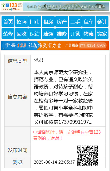 本人南京师范大学研究生,师范专业,已有语文政治英语教资,对待孩子耐心,帮助培养良好学习习惯,在家在校有多年一对一家教经验,暑假可带小学全科和初中英语数学,有需要咨询的家长可加微信17370991197 【电话咨询时,请一定说明在宁晋123看到的,谢谢!】 |