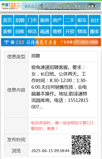 极兔速递招聘客服。要求:女,长白班。公休两天。工作时间:8:30-12:00;1:30-6:00.无任何销售性质,会电脑基本操作。地址;韵泽通物流园库房。电话:15512815007 【电话咨询时,请一定说明在宁晋123看到的,谢谢!】 |