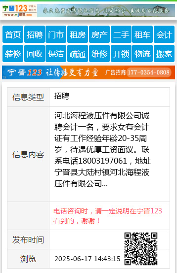 河北海程液压件有限公司诚聘会计一名,要求女有会计证有工作经验年龄20-35周岁,待遇优厚工资面议。联系电话18003197061,地址宁晋县大陆村镇河北海程液压件有限公司 【电话咨询时,请一定说明在宁晋123看到的,谢谢!】 |