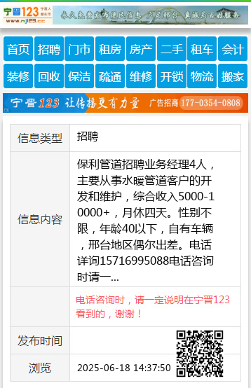 保利管道招聘业务经理4人,主要从事水暖管道客户的开发和维护,综合收入5000-10000+,月休四天。性别不限,年龄40以下,自有车辆,邢台地区偶尔出差。电话详询15716995088电话咨询时请一 【电话咨询时,请一定说明在宁晋123看到的,谢谢!】 |