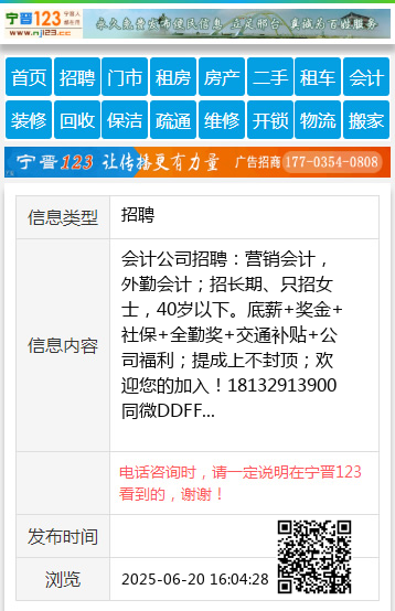 会计公司招聘:营销会计,外勤会计;招长期、只招女士,40岁以下。底薪+奖金+社保+全勤奖+交通补贴+公司福利;提成上不封顶;欢迎您的加入!18132913900同微DDFF 【电话咨询时,请一定说明在宁晋123看到的,谢谢!】 |