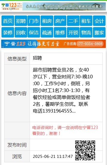超市招聘营业员2名,女40岁以下,营业时间7:30-晚10:00,工作9小时,倒班,另招小时工1名7:30-1:30,有餐饮经验或简单做饭经验者2名,暑期学生勿扰。联系电话13931964555 【电话咨询时,请一定说明在宁晋123看到的,谢谢!】 |