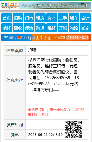 杉鼎汗蒸时代招聘:收银员、服务员、维修工师傅,有经验者优先综合薪资面议。咨询电话:15226898059、18031999927、地址:状元路上城御府东门... 【电话咨询时,请一定说明在宁晋123看到的,谢谢!】 |