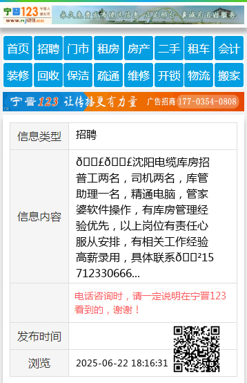 📣📣沈阳电缆库房招普工两名,司机两名,库管助理一名,精通电脑,管家婆软件操作,有库房管理经验优先,以上岗位有责任心服从安排,有相关工作经验高薪录用,具体联系📲15712330666 【电话咨询时,请一定说明在宁晋123看到的,谢谢!】 |