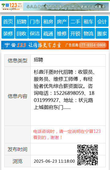 杉鼎汗蒸时代招聘:收银员、服务员、维修工师傅,有经验者优先综合薪资面议。咨询电话:15226898059、18031999927、地址:状元路上城御府东门... 【电话咨询时,请一定说明在宁晋123看到的,谢谢!】 |