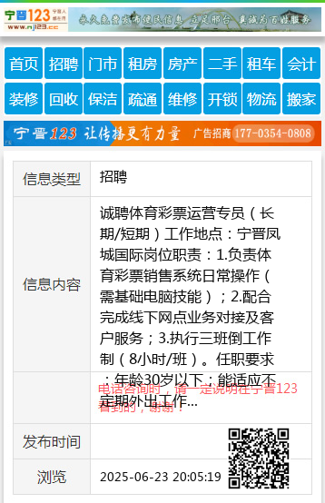 诚聘体育彩票运营专员(长期/短期)工作地点:宁晋凤城国际岗位职责:1.负责体育彩票销售系统日常操作(需基础电脑技能);2.配合完成线下网点业务对接及客户服务;3.执行三班倒工作制(8小时/班)。任职要求:年龄30岁以下;能适应不定期外出工作;责任心强,具备基础沟通能力。薪资福利:一天150周结包一顿饭外地可包食宿。联系电话17732866564王女士 【电话咨询时,请一定说明在宁晋123看到的,谢谢!】 |