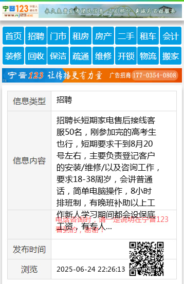 招聘长短期家电售后接线客服50名,刚参加完的高考生也行,短期要求干到8月20号左右,主要负责登记客户的安装/维修/以及咨询工作,要求18-38周岁,会讲普通话,简单电脑操作,8小时排班制,有晚班补助以上工作新人学习期间都会设保底工资,有专人带,包教包会,福利待遇:业绩红包+业绩奖品+绩效奖金 +过节福利+日常福利(水果,零食供应) 工作环境好,人事关系简单,欢迎踊跃报名。电话18107425265(微信同号) 正泰大厦 【电话咨询时,请一定说明在宁晋123看到的,谢谢!】 |