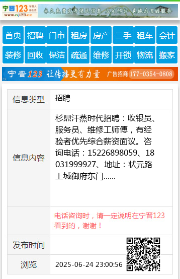 杉鼎汗蒸时代招聘:收银员、服务员、维修工师傅,有经验者优先综合薪资面议。咨询电话:15226898059、18031999927、地址:状元路上城御府东门... 【电话咨询时,请一定说明在宁晋123看到的,谢谢!】 |