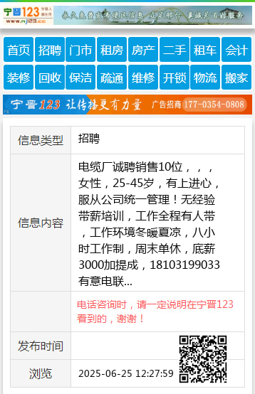 电缆厂诚聘销售10位,,,女性,25-45岁,有上进心,服从公司统一管理!无经验带薪培训,工作全程有人带,工作环境冬暖夏凉,八小时工作制,周末单休,底薪3000加提成,18103199033有意电联 【电话咨询时,请一定说明在宁晋123看到的,谢谢!】 |