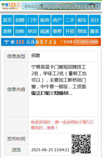 宁晋县蓝卡门窗现招聘技工2名,学徒工2名(暑假工也可以),主要加工断桥铝门窗,中午管一顿饭,工资面议,厂址:刘路村