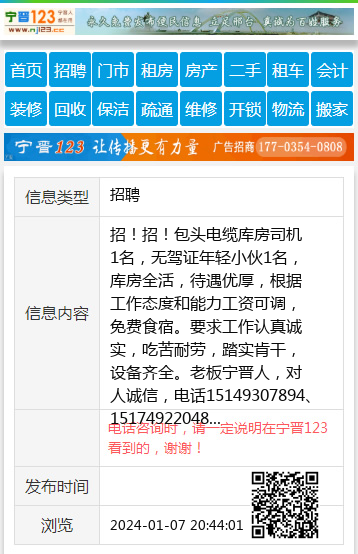 招!招!包头电缆库房司机1名,无驾证年轻小伙1名,库房全活,待遇优厚,根据工作态度和能力工资可调,免费食宿。要求工作认真诚实,吃苦耐劳,踏实肯干,设备齐全。老板宁晋人,对人诚信,电话15149307894、15174922048 【电话咨询时,请一定说明在宁晋123看到的,谢谢!】 |