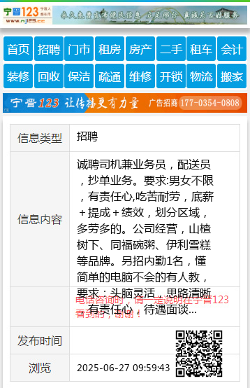 诚聘司机兼业务员,配送员,抄单业务。要求:男女不限,有责任心,吃苦耐劳,底薪+提成+绩效,划分区域,多劳多的。公司经营,山楂树下、同福碗粥、伊利雪糕等品牌。另招内勤1名,懂简单的电脑不会的有人教,要求:头脑灵活,思路清晰,有责任心,待遇面谈!地址:蔬菜市场北门。电话:15175930450(欢迎打电话咨询) 【电话咨询时,请一定说明在宁晋123看到的,谢谢!】 |