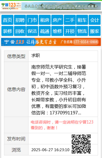 南京师范大学研究生,接暑假一对一、一对二辅导师范专业,可教小学全科、小升初,初中语数外预习复习,教资齐全,实习经历丰富,长期带家教,小升初目前有优惠,有需要的家长可加微信咨询:17370991197 【电话咨询时,请一定说明在宁晋123看到的,谢谢!】 |