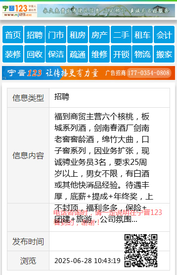福到商贸主营六个核桃,板城系列酒,剑南春酒厂剑南老窖窖龄酒,绵竹大曲,口子窖系列,因业务扩张,现诚骋业务员3名,要求25周岁以上,男女不限,有白酒或其他快消品经验。待遇丰厚,底薪+提成+年终奖,上不封顶,福利多多,保险+团建+旅游,公司氛围好,诚招各路人才共创光辉!联系电话13323190399或18931931045 【电话咨询时,请一定说明在宁晋123看到的,谢谢!】 |