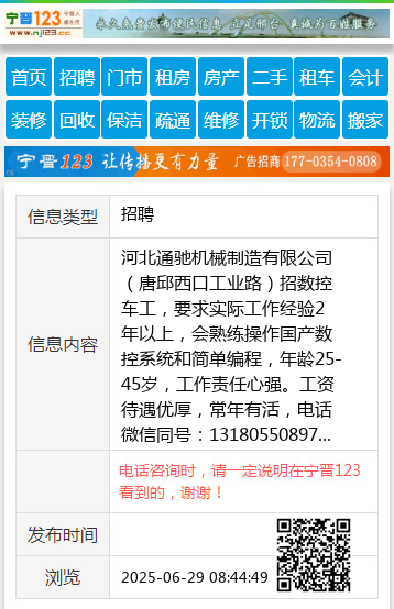 河北通驰机械制造有限公司(唐邱西口工业路)招数控车工,要求实际工作经验2年以上,会熟练操作国产数控系统和简单编程,年龄25-45岁,工作责任心强。工资待遇优厚,常年有活,电话微信同号:13180550897 【电话咨询时,请一定说明在宁晋123看到的,谢谢!】 |